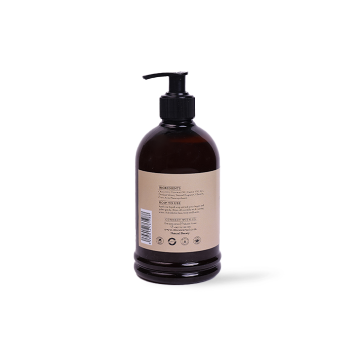 Apply our liquid soap and rub your fingers and palms gently. Rinse off carefully with running water. Suitable for face, body and hands.