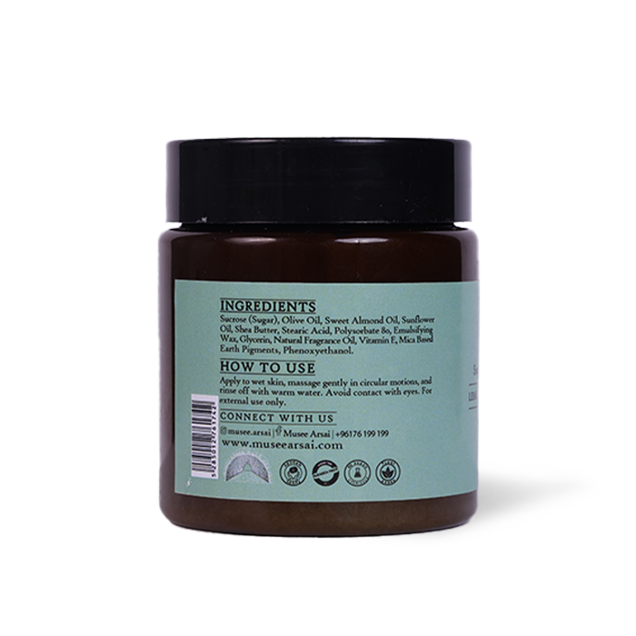 Sucrose (Sugar), Olive Oil, Sweet Almond Oil, Sunflower Oil, Shea Butter, Stearic Acid, Polysorbate 80, Emulsifying Wax, Glycerin, Natural Fragrance Oil, Vitamin E, Mica Based Earth Pigments, Phenoxyethanol.