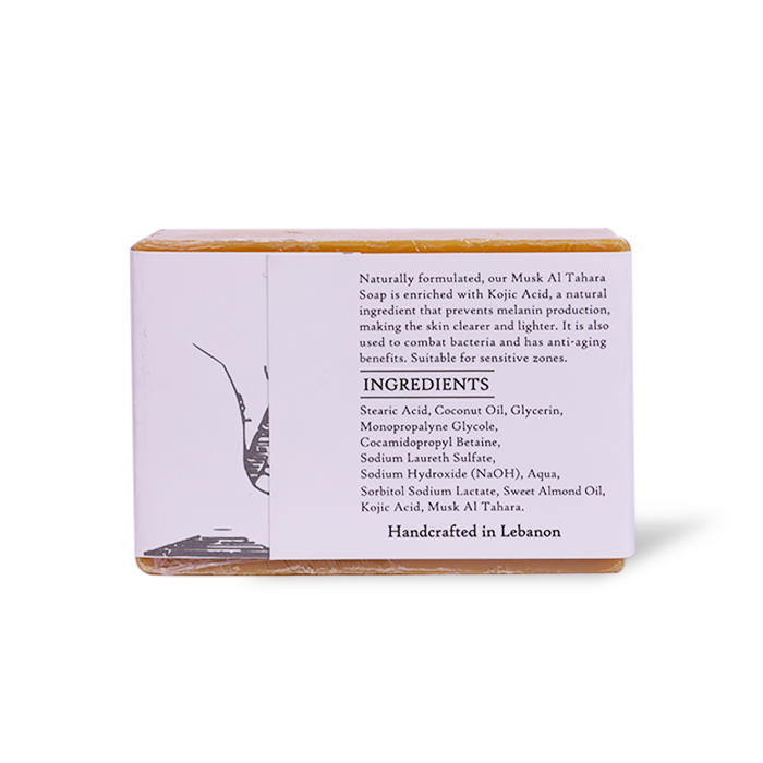 Stearic Acid, Coconut Oil, Glycerin, Monopropalyne Glycole, Cocamidopropyl Betaine, Sodium Laureth Sulfate, Sodium Hydroxide (NaOH), Aqua, Sorbitol Sodium Lactate, Sweet Almond Oil, Kojic Acid, Musk Al Tahara.