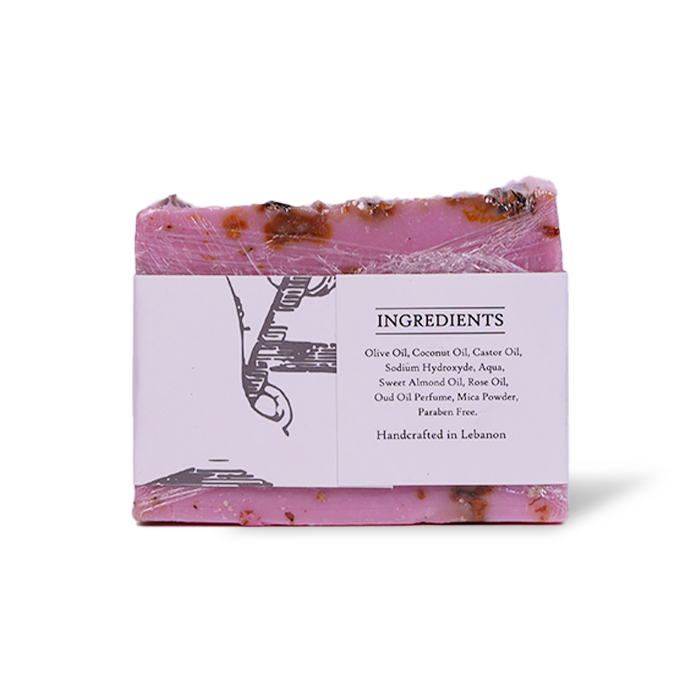 Olive Oil, Coconut Oil, Castor Oil, Sodium Hydroxyde, Aqua, Sweet Almond Oil, Rose Oil, Oud Oil Perfume, Mica Powder, Paraben Free.
